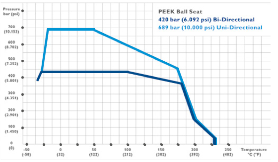میزان تحمل فشار در شیرآلات ابزار دقیق اس لاک سری بال ولو SFBV60 تا 6000psig معادل (413 بار) در 21°C معادل (70°F) می باشد. هم چنین در این سری از شیرآلات ابزار دقیق اس لاک میزان تحمل دما از 54C° (-65°F)- تا 177C° (350°F) با استاندارد سیت (قرارگیری) PCTFE برآورد شده است.