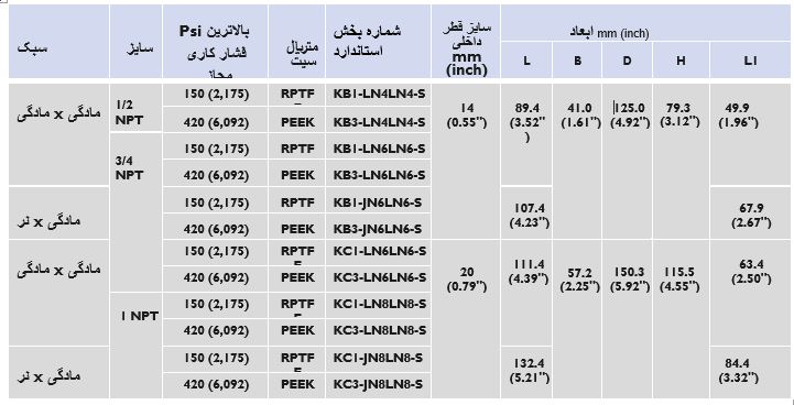 115 (4.52 اینچ) در شیر بال لو استیل KB و 145 (5.7 اینچ) در شیر بال ولو استیل سری KC.