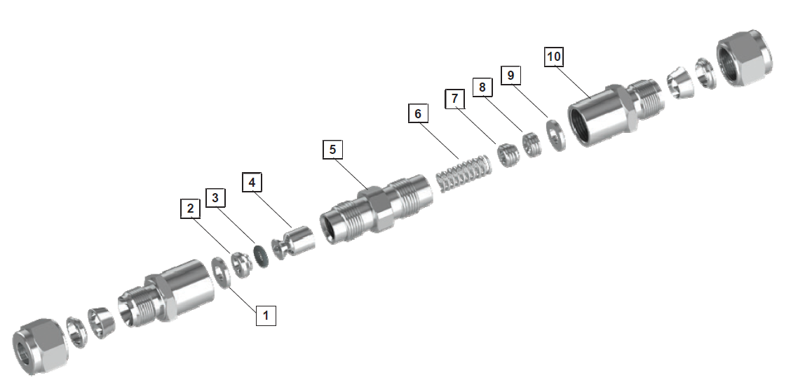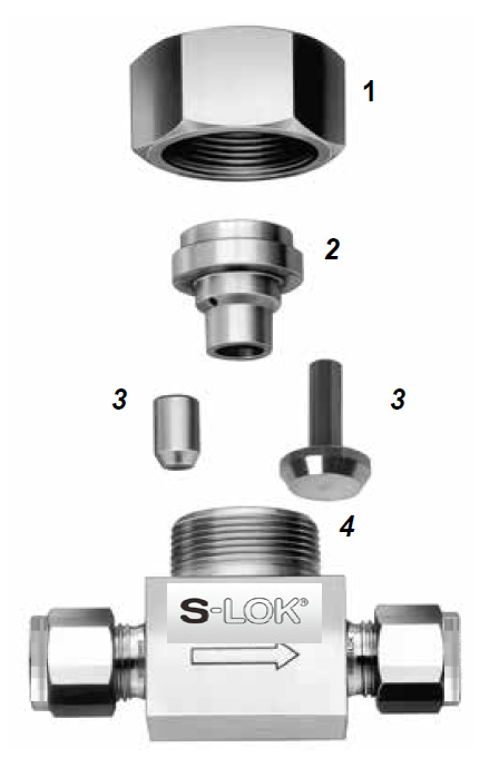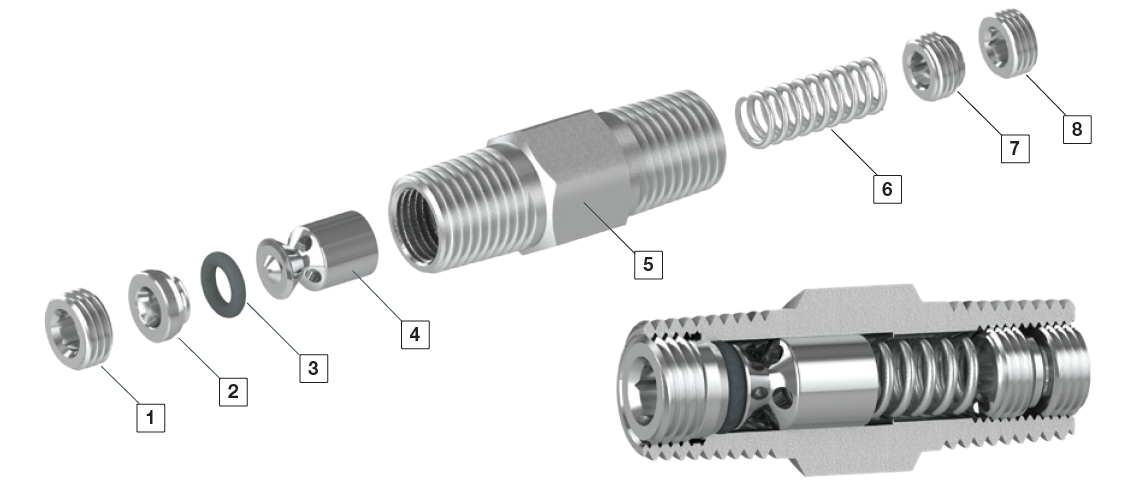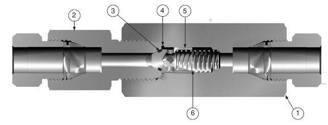 با توجه به اقسام قابل فروش چک ولو استنلس استیل، اجزا و کارکرد سری SCV30 را در ادامه توضیح میدهیم. اجزای چک ولو S-Lok را در شکل زیر میتوانید ببینید. 1- بدنه 2- کانکتور 3- سوپاپ 4- فنر 5- اورینگ با تأثیر سوپاپ برگشتی چرخشی، سیال بهآسانی میتواند رو به جلو جریان یابد. اما در صورت ایجاد جریان برگشتی، چرخش آن بر اثر نیروی برگشتی و فنر، مسدودکننده را در مسیر جریان محکم میکند. جنس و پارامترهای فنی اجزای فوق را میتوانید در کاتالوگ محصول ببینید. البته قطعات به کار رفته در انواع مختلف شیرهای اس لاک متفاوت هستند. اما تأثیر فنر، سوپاپ، اورینگ و مسدودکنندههای جریان در همه آنها تقریباً یکسان است.