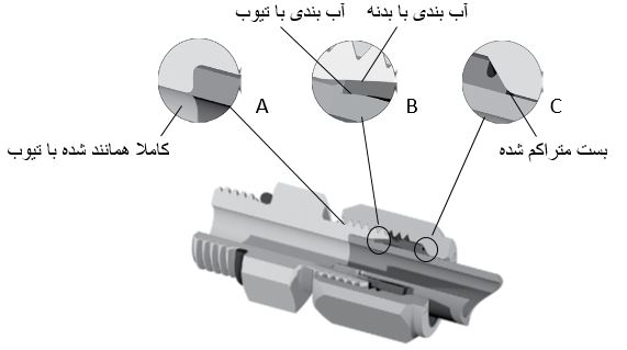 B. از آنجایی که فرول کانکتور ابزار دقیق به طرف جلو حرکت می کند، به محل قرار گیری باریک شده بدنه می رسد که باعث می شود فرول کانکتور ابزار دقیق با دماغه در تیوب وارد شود. لبه ی سخت شده فرول کانکتور ابزار دقیق یک برش 360° متناسب در قطر بیرونی تیوب ایجاد می کند. این برش اغلب حکم گیره سطحی را دارد. از آنجایی که فرول کانکتور ابزار دقیق به عنوان یک گیره سطحی عمل می کند، یک مرزبندی و شیار کوچک متریال در مقابل فرول کانکتور ابزار دقیق کنده شده است. این ارتباط درونی شیار تیوب با ظاهر جلویی فرول کانکتور ابزار دقیق و لبه ی گیره، تاب آوری کانکتور ابزار دقیق در برابر فشارهای بالا، بدون بروز نشتی و یا تخلیه را فراهم می کند. همچنین این کانکتور ابزار دقیق یک نقطه ی آب بندی دوم بین فرول خم شده (کمانی شده) و سیت بدنه ی کانکتور ابزار دقیق ایجاد کرده است.